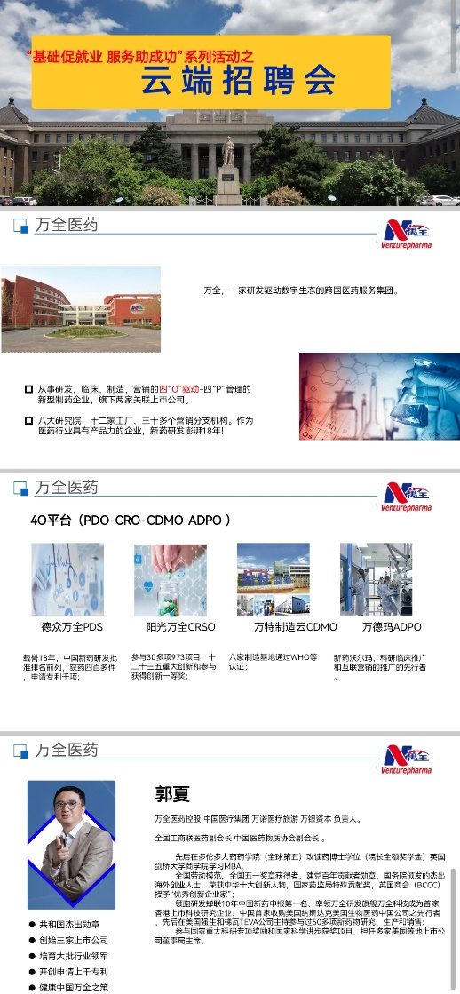 通过腾讯会议举办万全医药云端专场招聘会,院长王放、党委副书记曹国丽、副院长陈龙、研究生辅导员孙佳钰及全体研究生参加了会议。