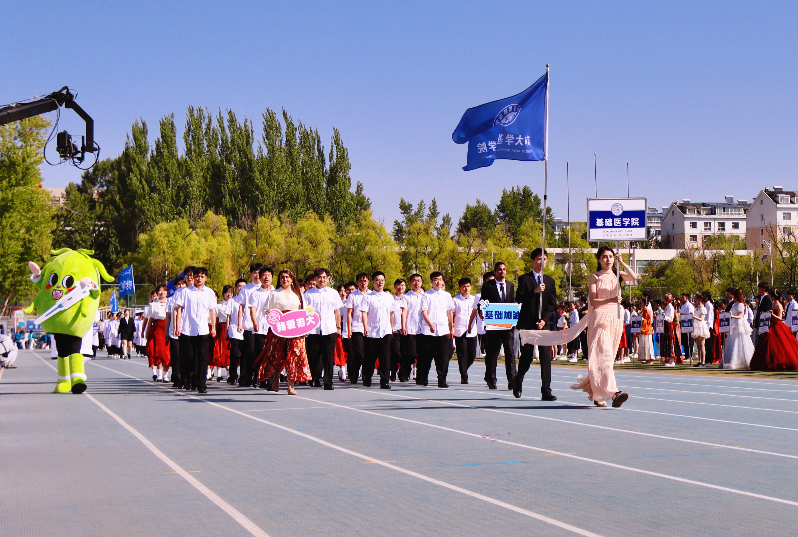 代表队伴随着激昂的旋律,以饱满的精神步入赛场。方队成员由我院本科生、研究生和留学生组成,首次亮相的吉祥物“小医”和“小智”,由学院老师和学生共同设计,展现了师生们丰富的想象力和对未来医学发展的期望与畅想。作为以生物医学科学专业白求恩班拔尖人才培养为引领,融合MBBS留学生的中国医学人工智能领航团队,他们承载着基础医学雄厚的学科底蕴,凝聚交叉融合创新之力,在“新医科”浪潮中破浪前行,在服务国家战略需求和人民生命健康的道路上,不断攀登新的高峰。本届运动会学院首次实现本科生、研究生、留学生与教职工们共同参赛,不同学历、不同国籍的学生们在运动会中互相学习、相互鼓励,共享体育竞技的乐趣,共同追求卓越的体育精神,加深了师生之间的交流与理解,构建积极向上的校园氛围。