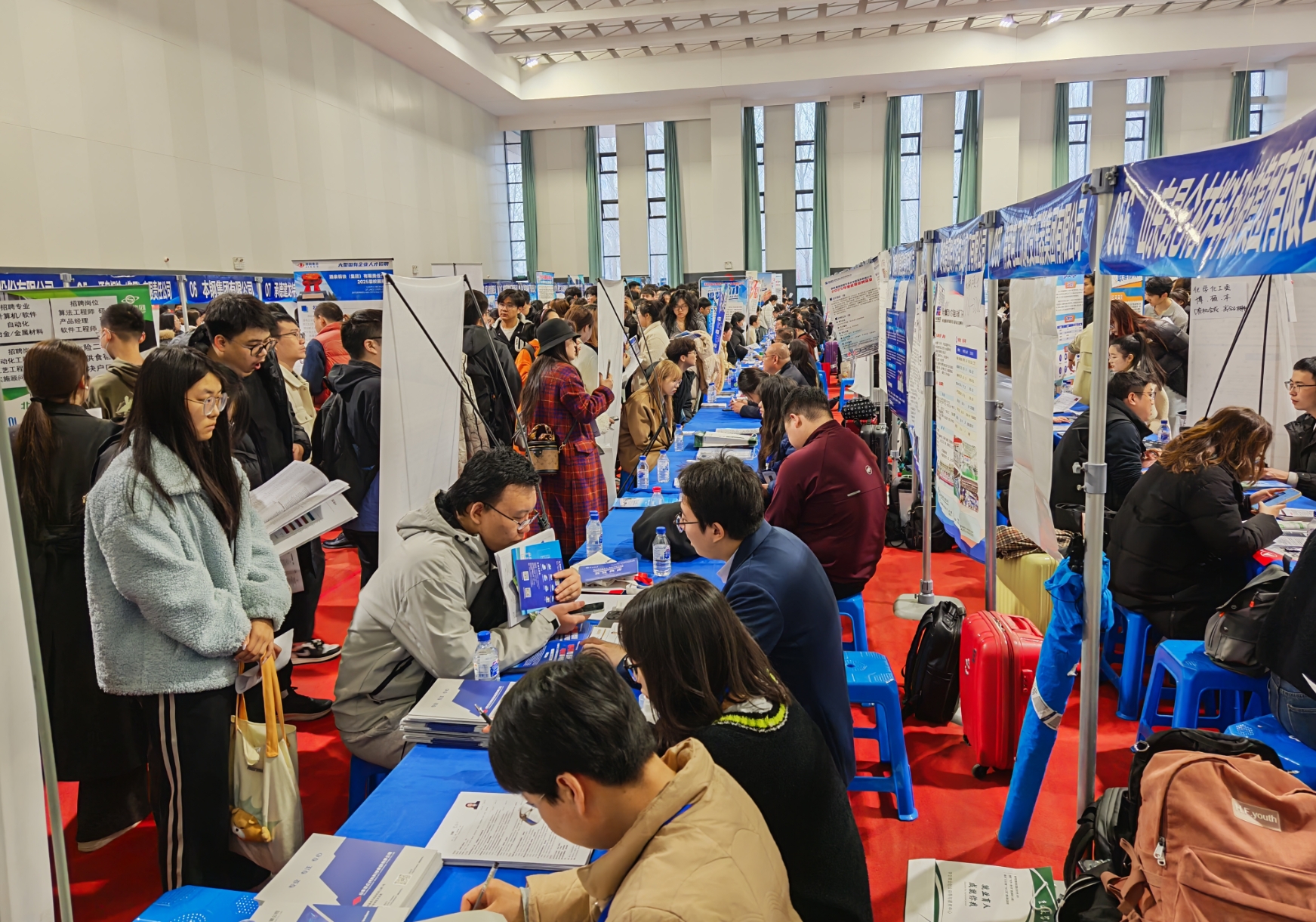 专场)在宋治平体育馆举行,基础医学院积极组织学生参加2025届春季双选会。学院领导在双选会前多方挖掘就业信息,积极与企业、校友等各方联系,为学生争取更多的就业机会。通过对就业市场的深入调研和分析,为学生提供了针对性的就业指导。在双选会当天,学院安排专人负责组织学生乘车及有序入场,确保学生能够顺利参加双选会。学院党委副书记李东洋书记、研究生辅导员孙佳钰老师也在现场为学生提供指导和帮助,解答学生在求职过程中遇到的问题。