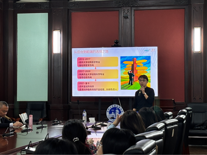 2012届校友、现任吉林金域市场部产品经理及科研负责人郇有为校友结合自身经历,向同学们分享了其在金域医学的职业发展历程。他从择业初衷、岗位成长、能力提升等方面进行了生动讲述,真实展现了金域医学良好的工作环境与广阔的发展平台,为在场同学提供了宝贵的职业参考。