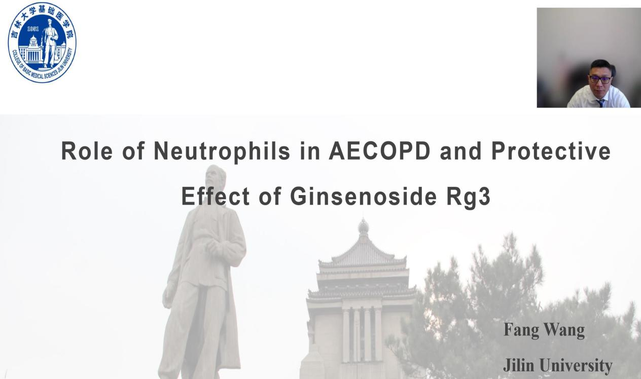 2022年10月25—28日,由韩国人参学会承办的第十三届国际人参学术研讨会,以线上线下相结合的方式在韩国首尔市举办,本次大会邀请来自韩国、中国、美国、瑞典、日本等十几个国家和地区的发言代表参会。我院王放教授受邀参加,并在线上做了题为“中性粒细胞在AECOPD发生中的作用及人参皂苷Rg3的保护机制研究”报告,介绍了人参皂苷Rg3能够通过抑制中性粒细胞PI3K信号通路的激活,从而减轻AECOPD中性粒细胞增多引起的炎症反应,提示人参皂苷Rg3具有开发为防治AECOPD药物的潜力,此项研究对攻克慢性阻塞性肺疾病产生积极的影响。