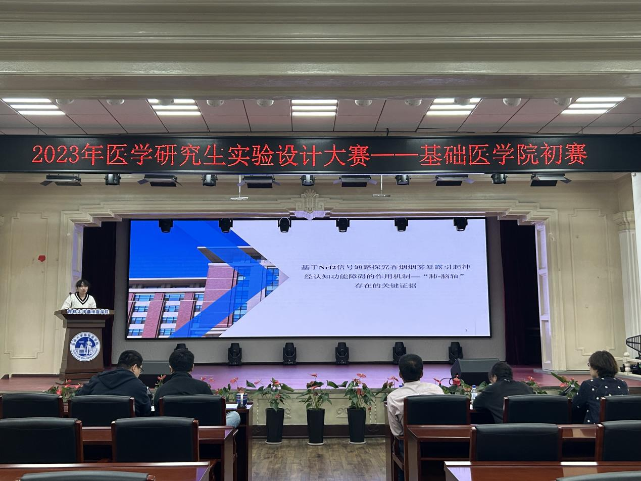 白求恩医学部2023年医学研究生实验设计大赛”的通知要求,我院于2023年10月13日在二楼报告厅举办了“2023年医学研究生实验设计大赛初赛”,邀请我院池光范教授、黄红兰教授、李冬教授、何侃教授、张丹丹教授担任评委,比赛由学院副院长李洪岩教授主持。