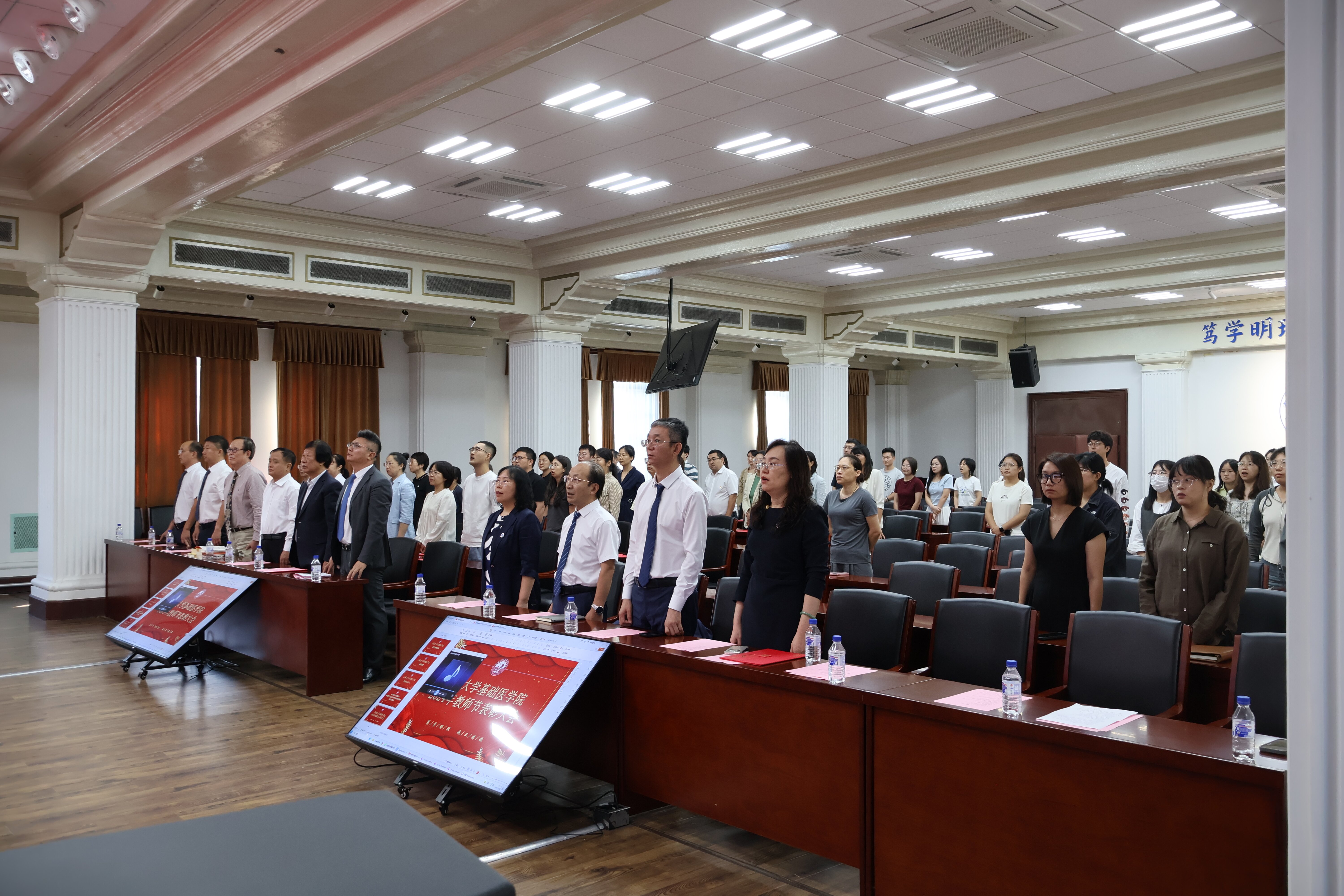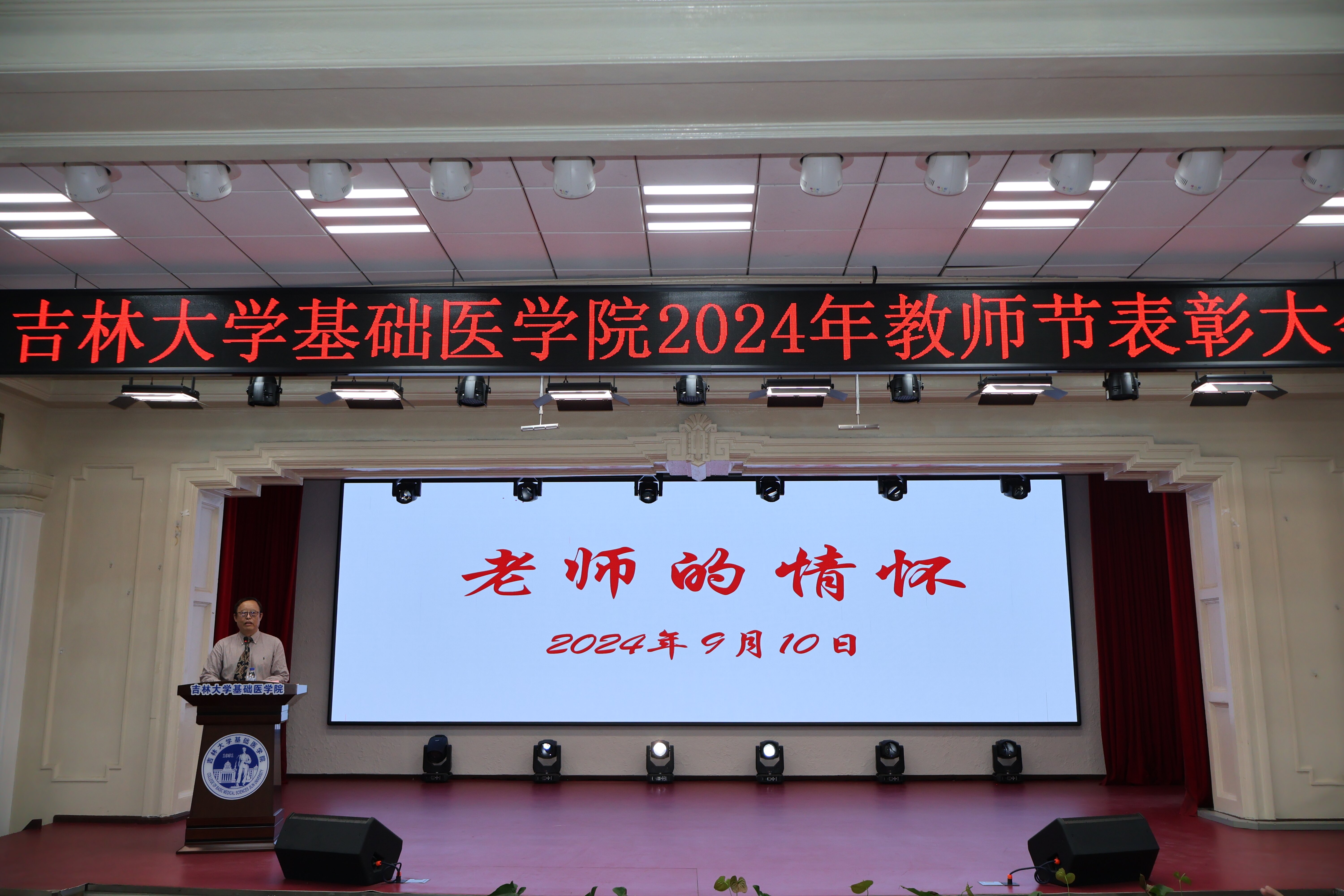隆重召开2024年教师节表彰大会。基础医学院党政领导班子成员、各学系主任、师生代表等一百余人参加大会。会议由党委副书记兼副院长李东洋主持。