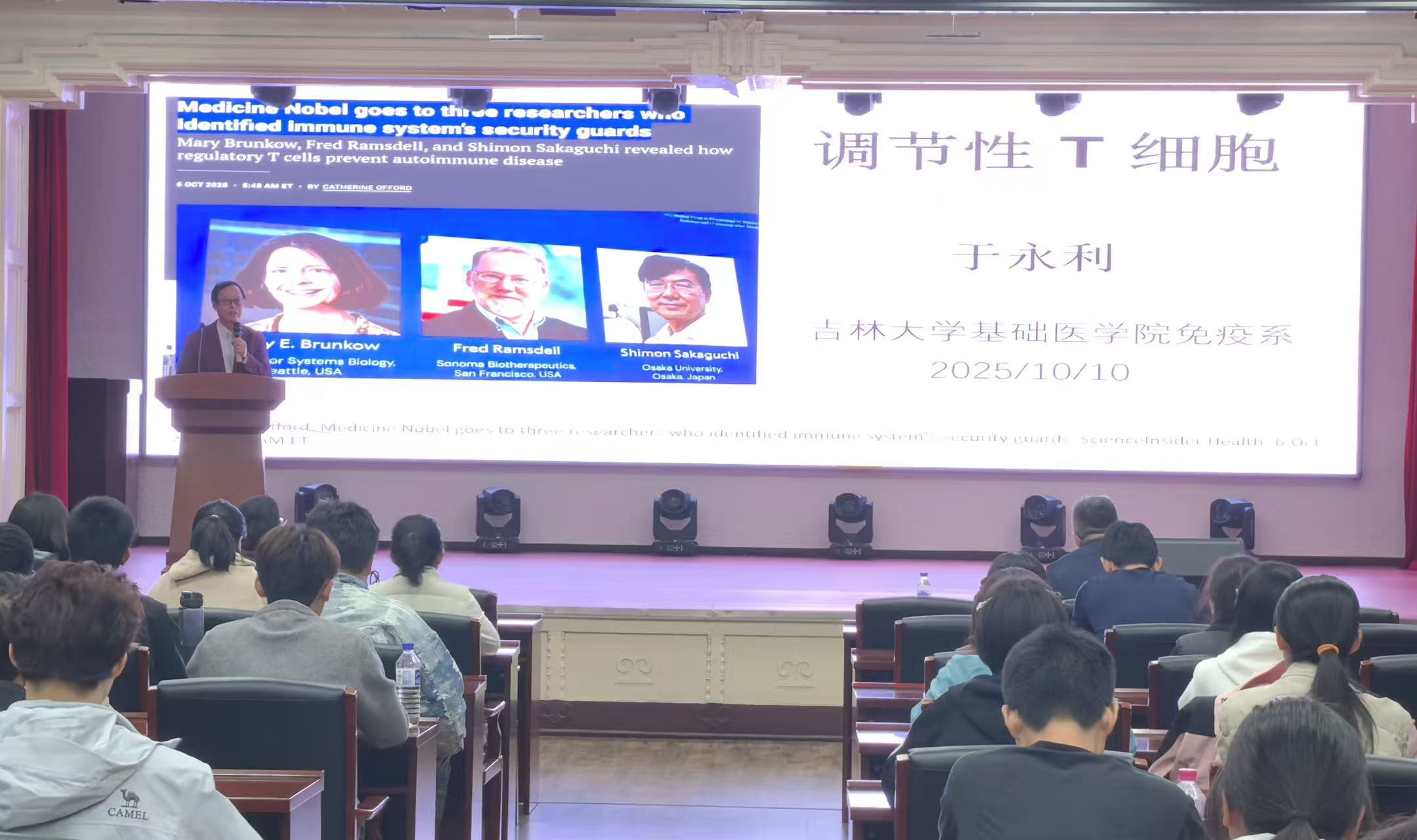 唐敖庆卓越教授、我院免疫学系于永利教授进行了题为“潜心基础医学研究 三十年磨一剑——2025年诺奖解读”的专题讲座。学院全体本科生和教师代表共200余人参加了本次讲座。