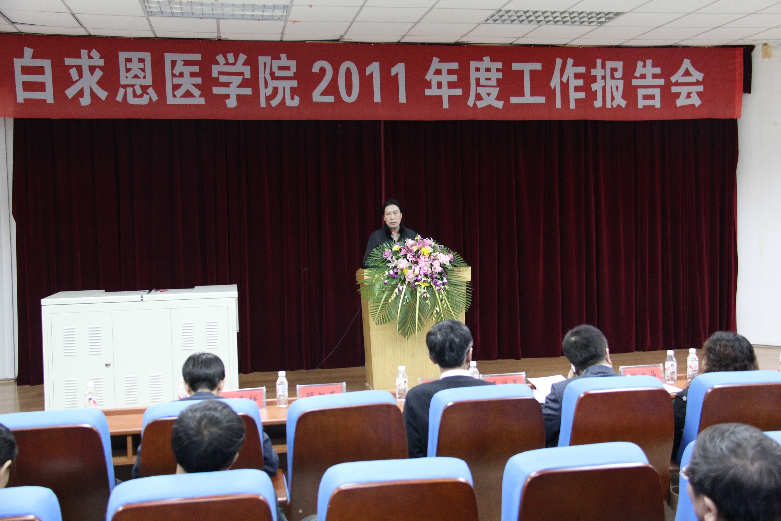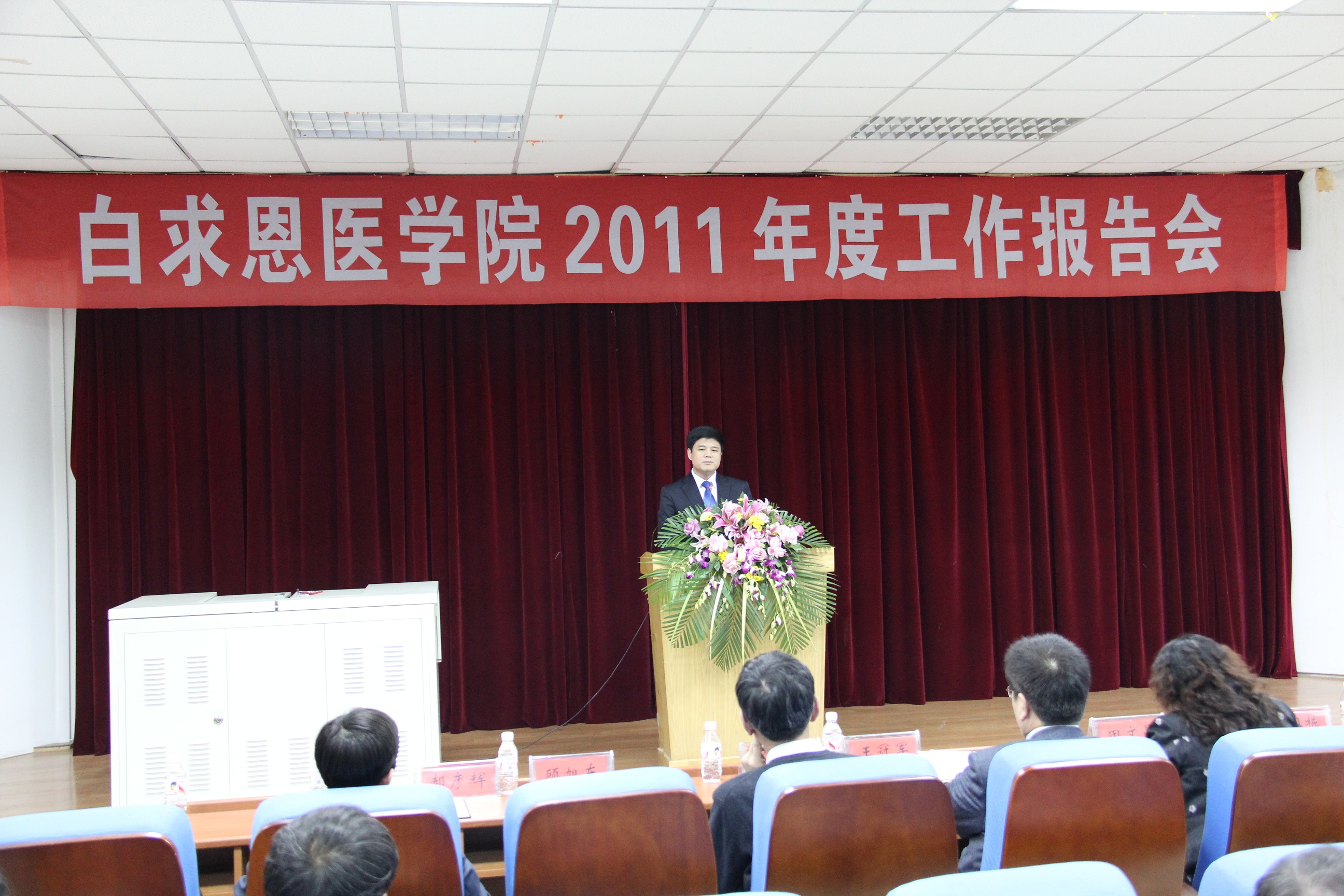 1月13日下午1时30分,白求恩医学院在新民校区第二教学楼2402教室召开2011年度工作报告会。副校长王冠军、学校检查调研组成员董德明、田文晶、张国兴、闫国栋、郝彦辉出席了报告会,学院党委委员、二级教代会代表、学术委员会委员、学位评定委员会委员、教学工作委员会委员、离退休职工代表、党支部书记、学生代表参加了报告会,会议由白求恩医学院行政副院长、学院教代会秘书长韩丽华主持。
