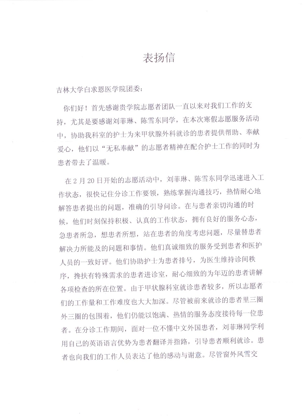 近日,白求恩医学院团委收到色情短剧 第一医院甲状腺外科小组寄来的表扬信。对我院志愿者团队为色情短剧 第一医院所做的志愿服务工作表示感谢,尤其是感谢701101班的刘菲琳同学和701002班的陈雪东同学,他们在寒假志愿者服务活动中协助科室护士为来甲状腺外科就诊的患者提供帮助、奉献爱心,以“无私奉献”的志愿者精神为患者带去了温暖。