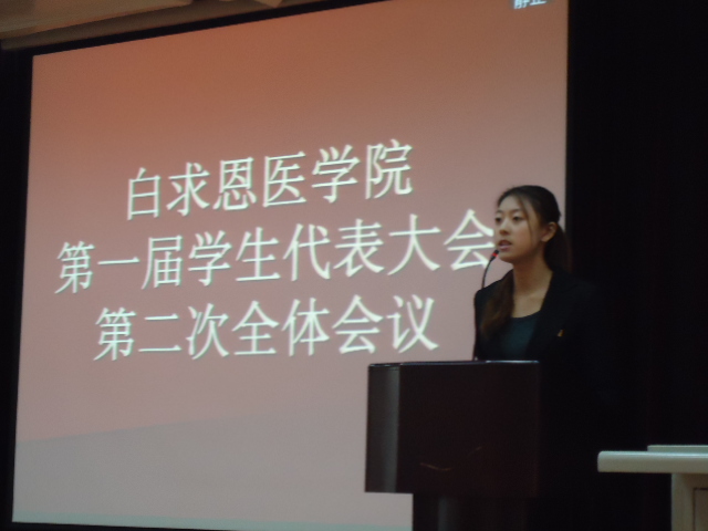 11月6日上午8时30分,白求恩医学院第一届学生代表大会第二次全体会议在基础楼二楼多功能学术报告厅举行。会议由团委副书记李玲玉主持,学院党委副书记兼副院长苑锐等出席了会议。会议的主要内容为评选白求恩医学院2010年“十佳大学生”,审议《白求恩医学院综合素质测评实施办法》。
