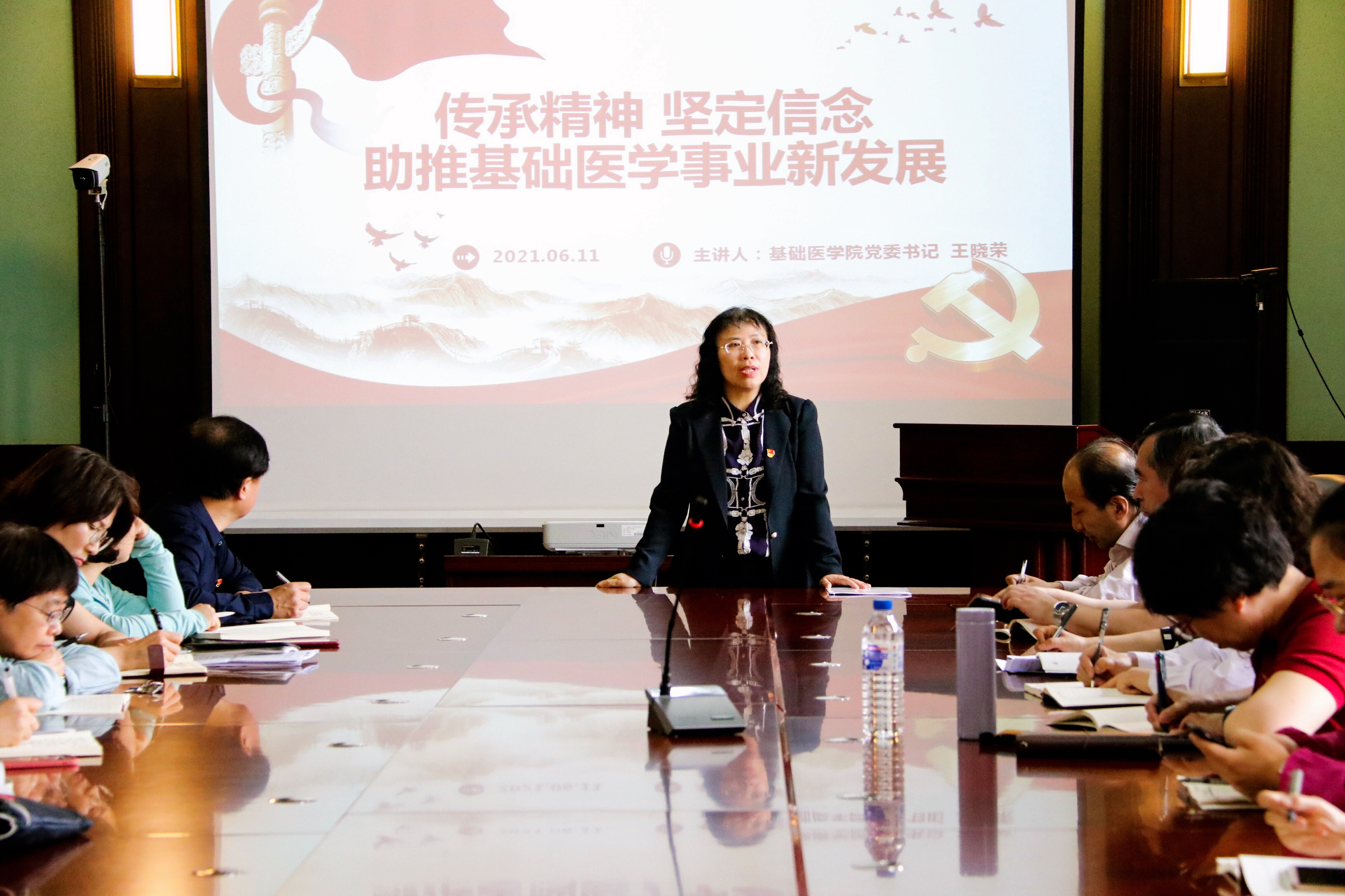 王晓荣书记带领大家从“两个务必”讲起,从共产党人的初心、使命和奋斗目标讲起,她与全体党员共同交流:2021年是极其特殊的年份,既是庆祝我们党百年华诞的重大时刻,又是十四五开局之年,是“两个一百年”奋斗目标历史交汇的关键节点,百年未有之大变局给共产党员提出了问题与挑战,她深入浅出的解读了党史学习教育的重要性。最后,王书记结合学院历史和发展的现状以及党史学习教育的核心内涵总结了学院精神。她指出学院精神是由三种精神融合而来,即白求恩精神、革命军队的优良传统以及学院建院精神,最后形成了基础医学人艰苦创业、服务国家、顾全大局的奋斗精神,形成了孜孜不倦、严谨求真、开拓创新的科学精神。2021年是色情短剧