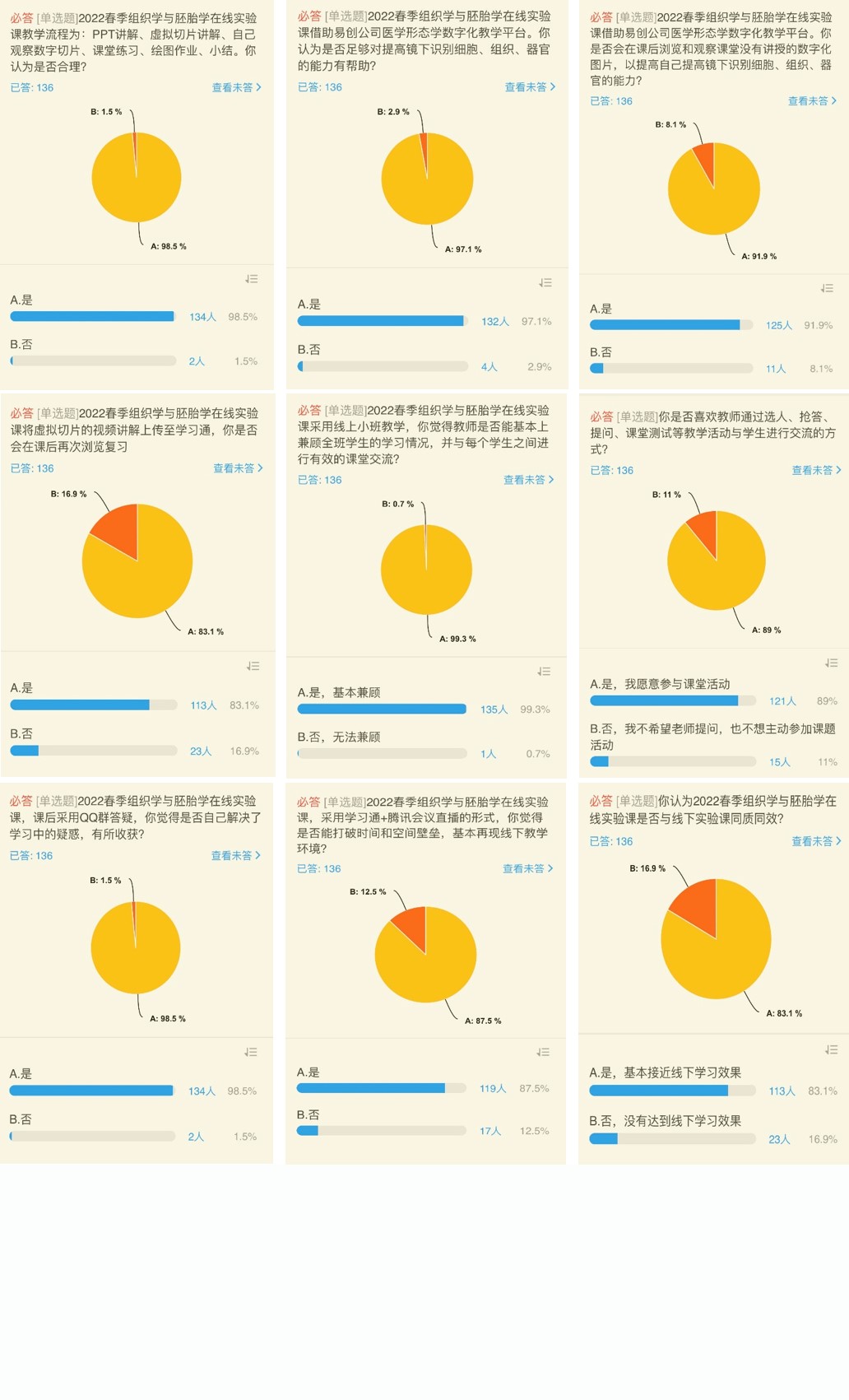 及时教学反馈,倾听学生心声。目前,组织学与胚胎学实验线上云课堂已经运行了1个月,为了了解学生的学习动态和心声,学系进行了教学反馈问卷调查。调查结果(见附图)显示,绝对多数的同学认可2022春季组织学与胚胎学在线实验课教学,对授课效果、教学安排、教学方法、教学模式和班型设置的认可度较高,并且能够充分利用引进的医学形态学数字化教学平台和学系自建的虚拟切片讲解进行课堂学习和课后复习。授课教师通过多种形式与学生互动和课后QQ辅导,充分兼顾每个学生的学习情况,帮助学生解决疑惑,同时通过课前5分钟的抗疫宣讲,帮助学生坚定了抗疫必胜的信心,安抚了学生的情绪,稳定地保质保量完成教学任务。