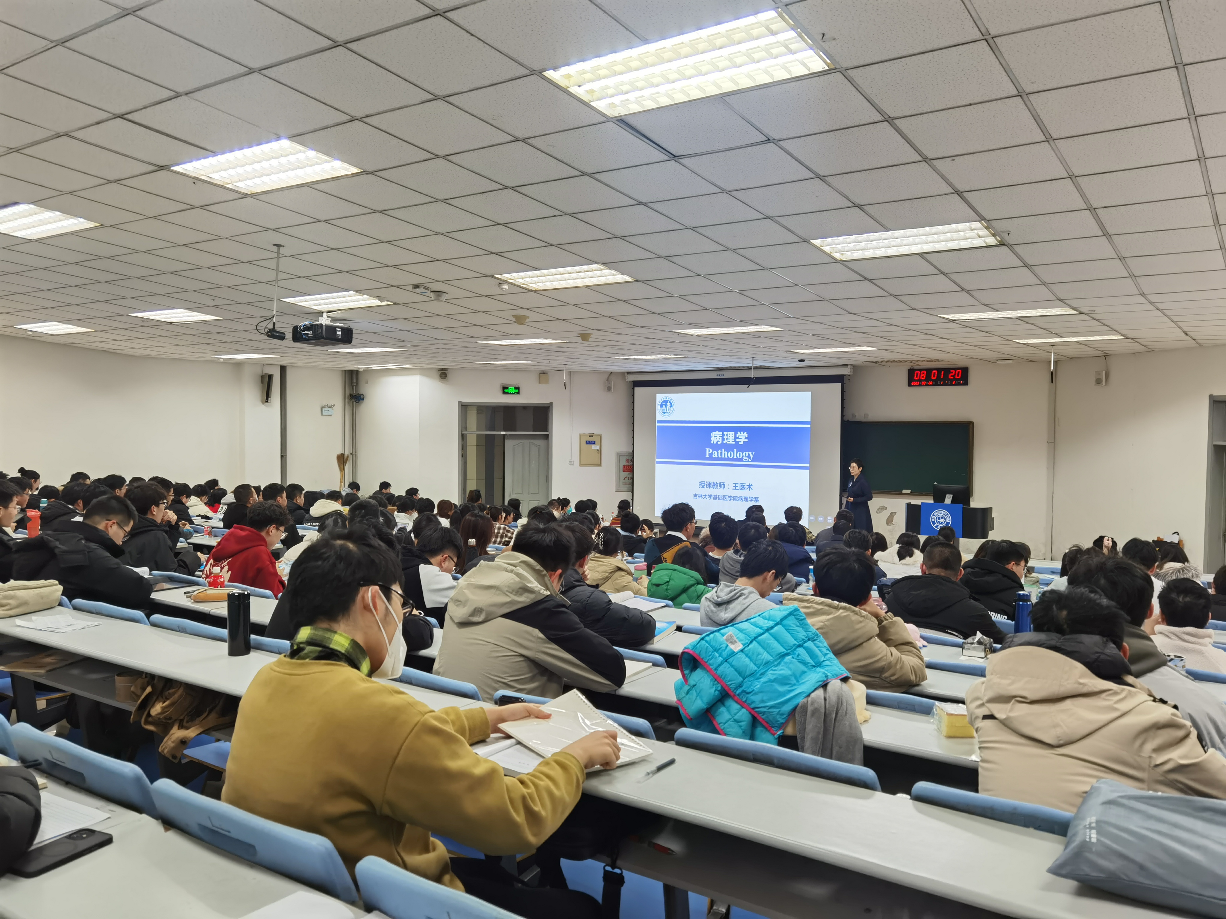病理学系王医术教授利用线上线下融合式教学模式讲授《病理学》绪论第一课,任课教师情绪饱满,授课灵活生动,课堂气氛活跃,学生们精神状态良好,积极参与学习通主题讨论、抢答等活动。学院领导们与同学们一起认真听课,仔细记录,对任课教师的教学设计与内容、教学方法与手段、教学技能和教学效果给予了充分的肯定。