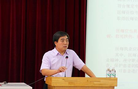 下午,王县成在新民校区第二教学楼2402教室为我校基础医学、临床医学等学科主任、教学组长、骨干教师、教学管理人员及相关专业学生作了以《国家医师资格考试和医师准入要求》为主题的报告。他从临床执业医师的基本要求(准入标准)切入,全面细致地从执业医师资格考试基本设计与实施、全国执业医师考试的基本情况、医师资格考试存在问题与改革设想等多个方面为师生进行讲解,他希望对医学生进行有的放矢的培养,把学生培养成为合格的医务工作者。何佳作了《色情短剧