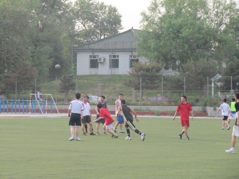 比赛分为博士队和硕士队,随着裁判的一声哨响,双方立即展开激烈的争夺。双方队员在场上左突右攻,积极拼抢、盘带、进攻、退防…颇有职业球员的风范。上半场,博士队率先进入状态,凭借较好的团队技术和个人突破能力以4:0领先上半场。硕士队暂居下风,有几个势在必得的球不是打在门柱或门楣上,就是被博士队的守门员郭亚雄飞身扑救挡出。下半场开始后,硕士队重整旗鼓,积极组织进攻,主力前锋王伟伟凭借一记角度刁钻的射门使得硕士队将比分扳回一分。场外观众愈发多了起来,加油声、叫好声不绝于耳,观众的热情鼓舞了球场上的每一位球员,他们在场上更加活跃、更加兴奋。最后,博士队的队员通过奋力拼搏,通力合作,抵挡住了硕士队的猛烈攻击,最终以4:2战胜了硕士队。