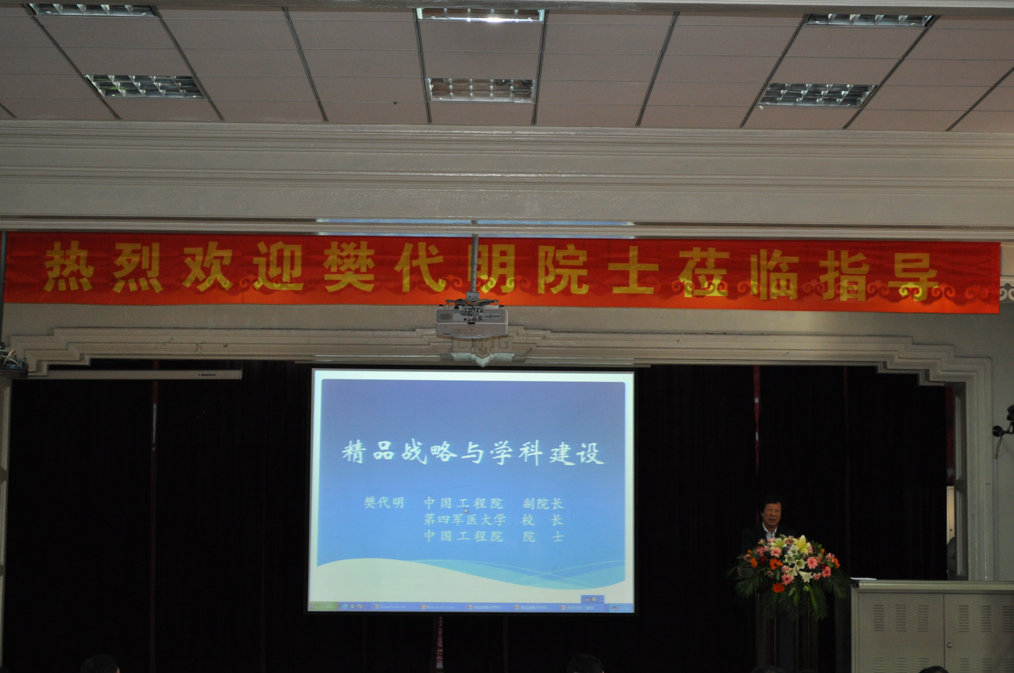 樊代明院士立足第四军医大学发展历程,阐述了由“开启至开明”、“开整至开心”、“开发至开放”、“开减至开创”的“四开”跨越发展。重点阐述了第四军医大学以“精品讲座”、“精品课程”、“精湛医术”等为核心的“精品战略”工程。整个报告会现场座无虚席,樊院士的精彩讲演深入浅出、旁征博引、幽默风趣,期间时时报以热烈而持续的掌声。报告会结束后,在座领导、老师、学生分别就管理、教学、学习等方面踊跃提问,樊院士根据自己的经验详细耐心的做了解答。本场报告会为学院学科建设拓宽了思路,并为学院的发展提供了较多可供借鉴的经验。